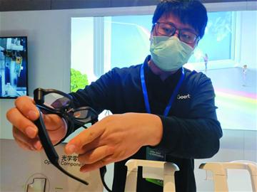 光学大厅的主展台上,展示着一副“护目镜”,看似简单,其实却是高科技的产物。工作人员介绍,这是一台“AR一体机”。参观者佩戴上眼镜后,可以实现叠加在现实场景中的丰富多彩视觉体验。