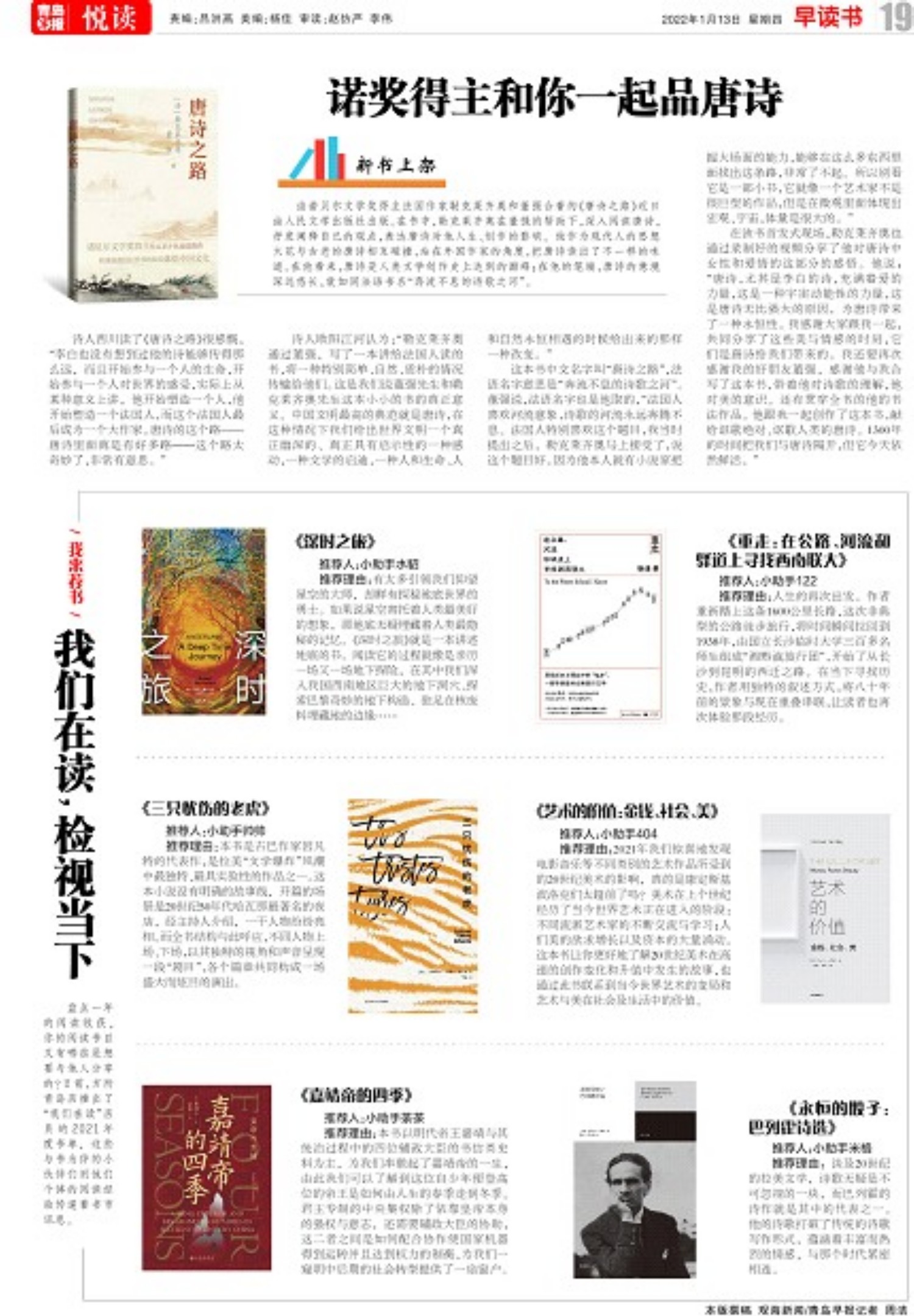 由诺贝尔文学奖得主法国作家勒克莱齐奥和董强合著的《唐诗之路》近日由人民文学出版社出版。在书中,勒克莱齐奥在董强的帮助下,深入阅读唐诗,抒发阐释自己的观点,表达唐诗对他人生、创作的影响。他作为现代人的思想火花与古老的唐诗相互碰撞,站在外国作家的角度,把唐诗读出了不一样的味道。在他看来,唐诗是人类文学创作史上达到的巅峰;在他的笔端,唐诗的意境深远悠长,就如同法语书名“奔流不息的诗歌之河”。