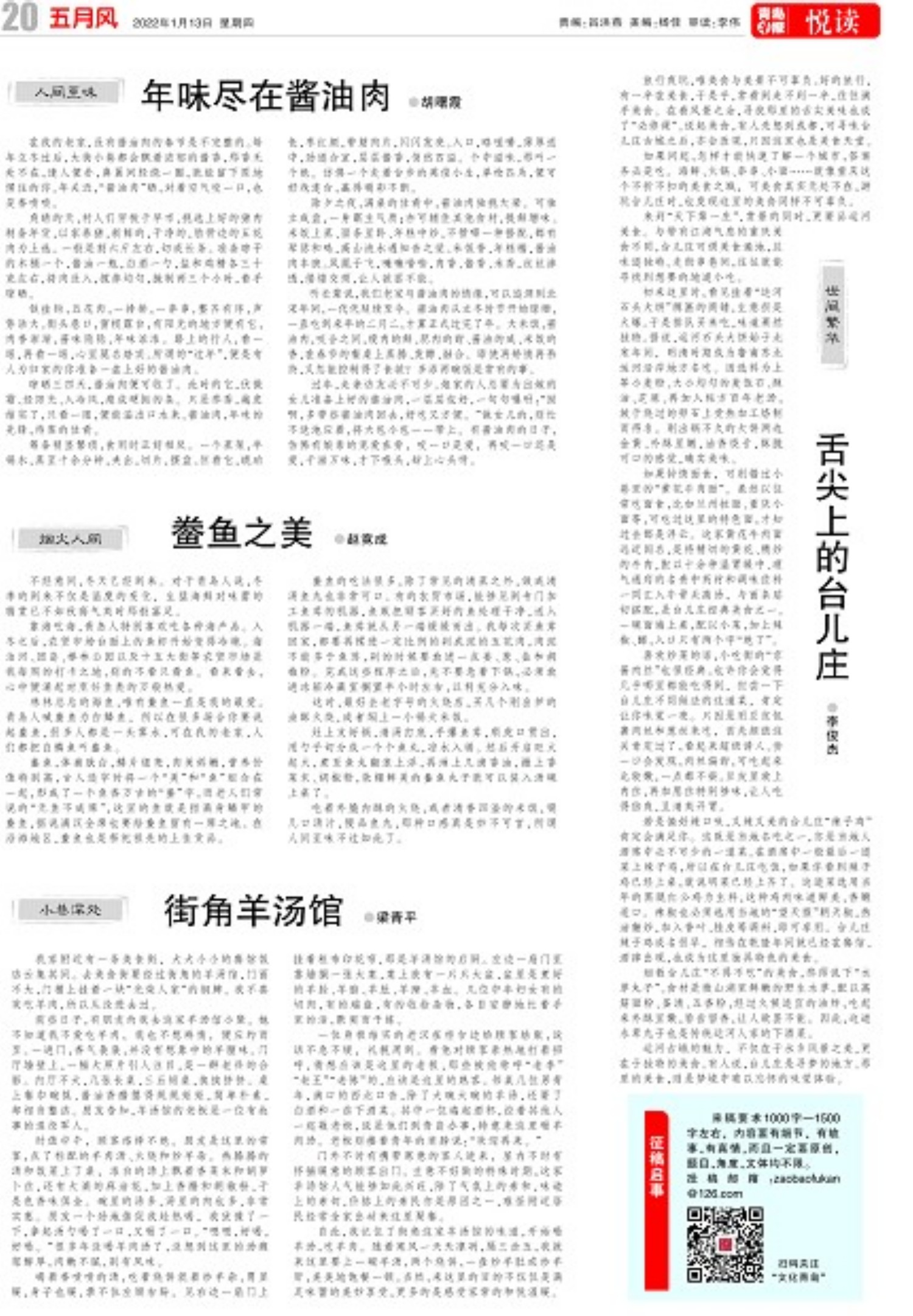 一位身板结实的老汉在柜台边给顾客结账,说话不急不缓,礼貌周到。看他对顾客亲热地打着招呼,猜想应该是这里的老板,那些被他称呼“老李”“老王”“老陈”的,应该是这里的熟客。邻桌几位男青年,满口的西北口音,除了大碗大碗的羊汤,还要了白酒和一些下酒菜。其中一位端起酒杯,拉着其他人一起敬老板,说是他们到青岛办事,特意来这里喝羊肉汤。老板则搂着青年的肩膀说:“欢迎再来。 ”
