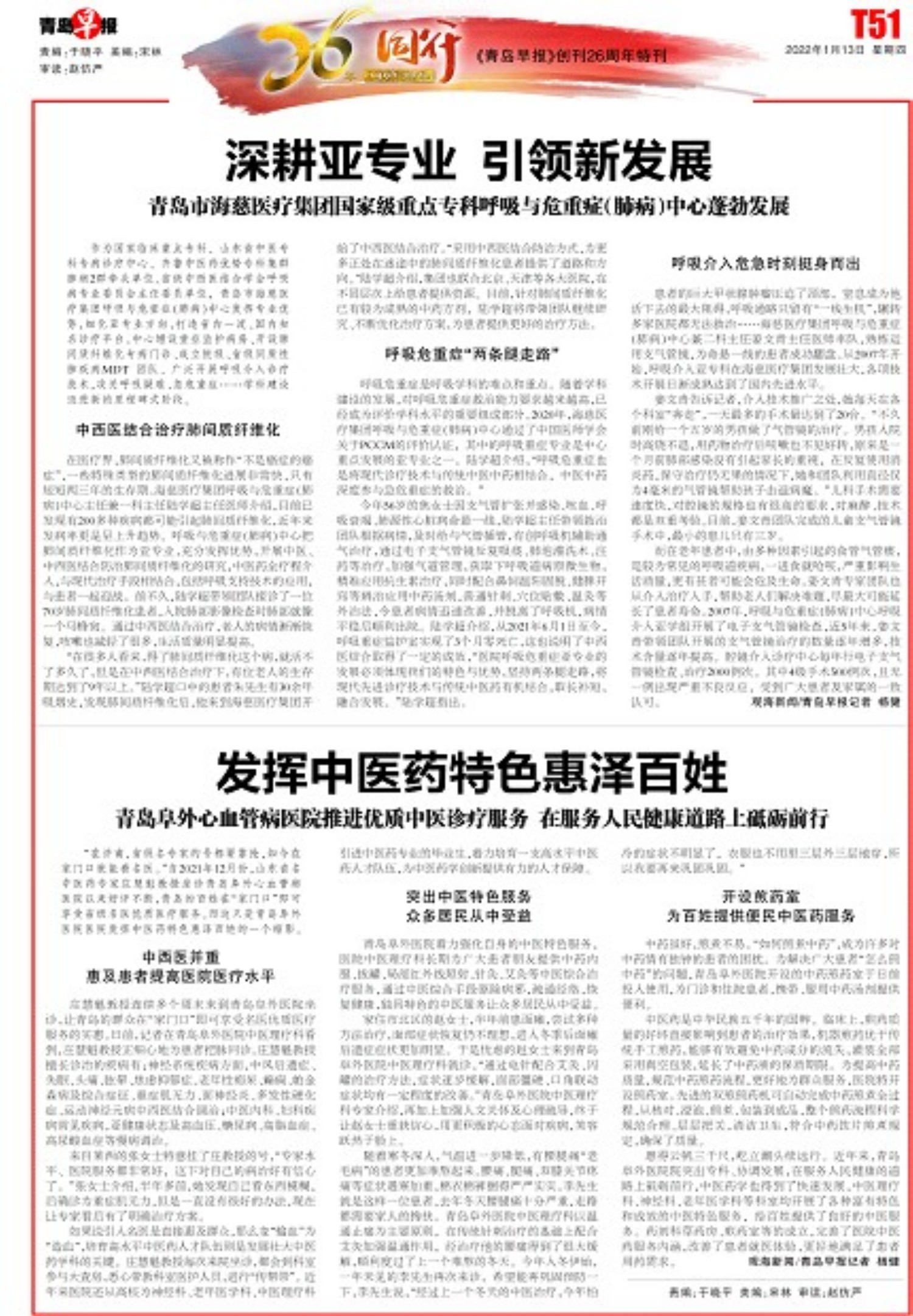 作为国家临床重点专科、山东省中医专科专病诊疗中心、齐鲁中医药优势专科集群肺病2群牵头单位、省级中西医结合学会呼吸病专业委员会主任委员单位,青岛市海慈医疗集团呼吸与危重症(肺病)中心发挥专业优势,细化亚专业方向,打造省内一流、国内知名诊疗平台。中心增设重症监护病房、开设肺间质纤维化专病门诊、成立院级、省级间质性肺疾病MDT团队、广泛开展呼吸介入诊疗技术,攻关呼吸疑难、急危重症……学科建设迈进新的里程碑式阶段。