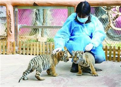 目前,青岛森林野生动物世界共有5只虎宝宝。其中,2只两个月大的东北虎宝宝日前曾在媒体镜头前短暂亮相,一出场便萌翻了在场的记者。在育幼员“奶妈”的精心照顾下,两只小老虎精神头十足。记者了解到,除了这2只两个月大的虎宝宝,青岛森林野生动物世界还有2只一个月大的东北虎宝宝和1只不满月的孟加拉白虎宝宝。目前,五只虎宝宝将在春节期间集体亮相“拜年”。