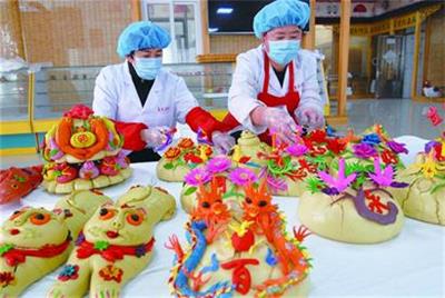 由于没有教材、没有图样,做花馍这门传统手艺全凭一代代人口传心授,一把小剪刀、一根筷子,再加上一双双巧手,一个个普通的面团就变成了活灵活现、造型各异的艺术品。伴随着热腾腾的蒸汽,颜色艳丽、造型各异的花馍从蒸箱里端出来,香气扑鼻而来,年味儿好似更浓了。