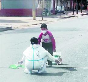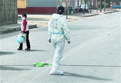 记者了解到,15日当天,王云晓得知家里的老人生病,便向队长请假购买药物,准备在执行任务的间隙顺路送到村口。由于执行消杀任务的需要,所以在村口见到儿子时,王云晓只能站在一米开外,当听到儿子说想妈妈抱抱的时候,王云晓的眼泪就有点忍不住了。她告诉孩子,“妈妈正在和病毒打仗,出于安全考虑,现在不能抱你。等疫情结束回家后,一定好好抱抱你。 ”说完,王云晓伸出手臂,与一米外的儿子来了一个“隔空拥抱”。