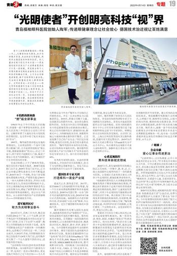 2022年1月,青岛福柏眼科医院崂山院区正式亮相。一所集中、德、美、法、日、瑞士各国眼科尖端黑科技于一身的眼视光医院,让岛城正式迎来真正意义上的青少年近视防控、眼镜验配革命性时代。“福柏眼科黑科技八大步骤能够更精确地发现孩子眼球视轴的轴长数据,判断出该年龄段孩子近视不同的类别或预测近视发展的曲线,做好‘儿童视觉发育档案’,对青少年近视防控可提前做出预防性的诊疗方案,真正做到了青少年近视及多项眼病的积极预防,有效管理,精准矫正三阶段的医学解决方案。”陶军激动地说道,共同呵护好孩子的眼睛,让他们拥有一个光明的未来,这是国家的号召,更是自己的心愿。