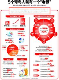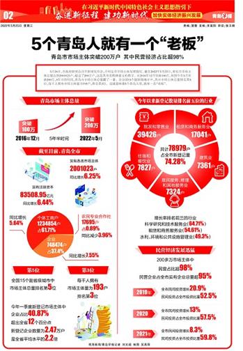 5月24日,市政府新闻办召开新闻发布会,介绍全市市场主体发展情况。截至2022年5月23日,青岛市市场主体总量达到2001023户,超过了200万户,这是具有里程碑意义的数字。从2016年12月突破100万,再到今年5月突破200万,5年半的时间,青岛市市场主体总量翻了一番。在全国15个副省级城市中,我市市场主体总量排名第5位,每千人拥有市场主体量为193户,排名第3位。这就意味着5个青岛人里,就有一名“老板”。