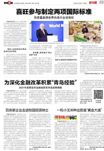 喜旺对标准化工作的重视贯彻始终,自2009年起,就先后参与了国家《酱卤肉制品》《中式香肠》《低温肉制品质量安全要求》等20多项国家、行业标准的编写、修订工作。 2021年底,国家标准化管理委员会公布了第二批国家级消费品标准化试点项目名单,喜旺集团成功入选。
