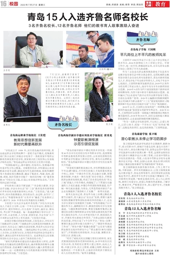 7月12日,省教育厅发布了《关于公布山东省第二批齐鲁名师名校长(中等职业教育)名单的通知》,全省共有17名齐鲁名校长建设工程人选和79名齐鲁名师建设工程人选考核合格,分别认定为齐鲁名校长、齐鲁名师。其中,青岛有12人被认定为齐鲁名师,3人被认定为齐鲁名校长。让我们一起走近部分齐鲁名师名校长,他们把汗水和希望洒在教育这片土地上,让我们感受到向上奋进的先进力量。