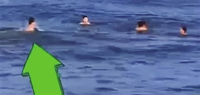 于杰(箭头处)奋力游向遇险男子(红圈处)。 视频截图