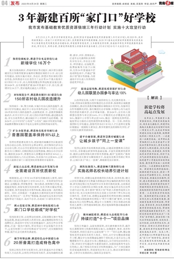 8月23日上午,我市召开新闻发布会,发布《青岛市基础教育优质资源倍增三年行动计划》,到2024年,我市将培育推出一批家门口好学校(幼儿园)、优质教育集团和教育强镇,各区(市)基本达到国家学前教育普及普惠县和义务教育优质均衡发展县创建标准,学前教育普惠优质、义务教育优质均衡、普通高中特色多样发展格局基本形成,学位充足、布局合理、资源优质的教育公共服务体系基本建立。《行动计划》分为十大攻坚行动。