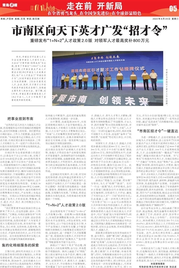 会议现场发布了市南区“1+N+2”人才政策2.0版。在政策1.0版的基础上,市南区新调整政策22条,其中10项奖补水平全国领先、3项全省领先、9项全市领先,以1个综合性意见为引领、5个产业领域人才细则为支撑、2个配套细则为保障的人才政策体系实现迭代升级、全面进化,进一步提升了人才政策覆盖广度、奖励扶持力度和人才评价科学性,市南区还将在“政策找人”“免申即享”等配套服务方面下足功夫。