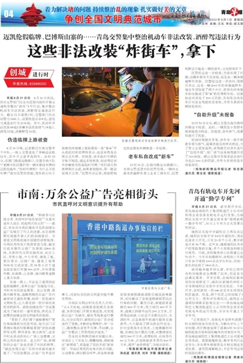 市南区文明办相关负责人介绍:“从6月份起,创城督查组联合各街道、各责任部门开展实地巡查,对发现的公益广告缺失、褪色等现象进行整改,对全区陈旧、破损的公益广告全部进行了更换,并做好定期维护,举一反三,确保整治成效不反弹、不回潮,公益广告整治工作取得初步成效。”