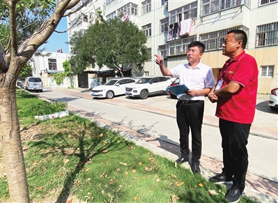 “兵支书”张建国(左)走访社区了解情况。受访者供图