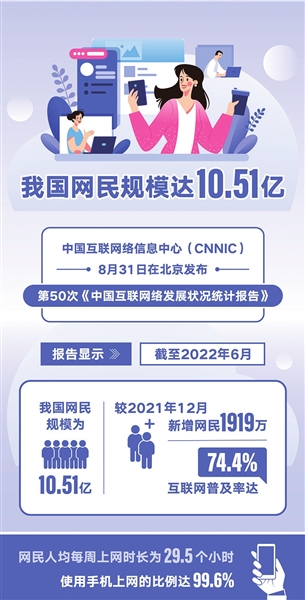 新华社北京8月31日电 中国互联网络信息中心(CNNIC)31日在京发布第50次《中国互联网络发展状况统计报告》。报告显示,截至2022年6月,我国网民规模为10.51亿,较2021年12月新增网民1919万,互联网普及率达74.4%。网民人均每周上网时长为29.5个小时,使用手机上网的比例达99.6%。