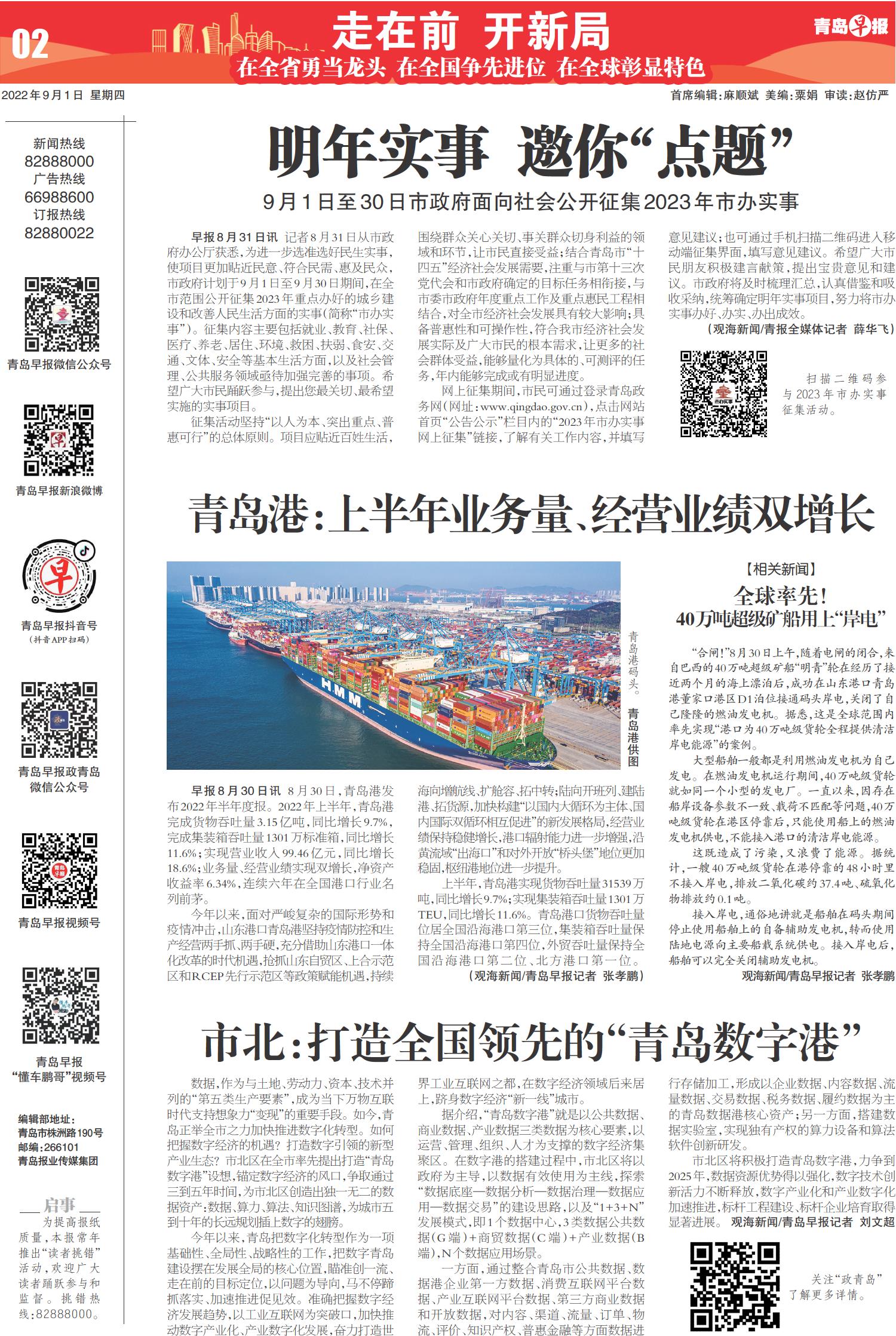 明年实事 邀你“点题” 青岛港:上半年业务量、经营业绩双增长 市北:打造全国领先的“青岛数字港” 启事