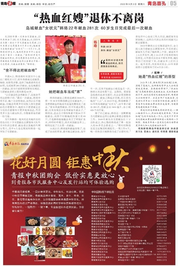 从2000年第一次参加无偿献血,22年共参加了281次无偿献血;从2009年成为第一批红十字无偿献血志愿者,13年来累计志愿服务4万多小时;她被誉为岛城的献血“女状元”……9月2日,是韩珞60岁生日,她来到青岛市中心血站完成了最后一次献血。“虽然60岁是无偿献血的终点,但志愿服务没有终点,我将继续在无偿献血这项公益事业中做一名志愿者,为献血者服务。”韩珞说。