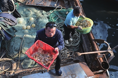 码头上,归来的渔船鱼虾满舱。