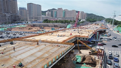 9日,记者在海尔路—银川路立交工程现场看到,该项目的银川路上跨海尔路主线桥梁已经露出了雏形,施工人员正分散在不同区域各自忙碌作业,整个项目呈现出一派热火朝天的建设景象。据了解,海尔路—银川路立交工程汇集胶州湾大桥、青银高速等多条对外辐射通道,是青岛东岸城区对外交通的门户节点。“8日晚,最后一段钢箱梁完成吊装,主桥的最后拼装完成了。”张厚喜介绍,海尔路—银川路项目是我市首个采用预制装配式施工技术的立交桥项目。该技术是在桥梁建造过程中,将桥梁的墩柱、盖梁、箱梁等部位在预制场站提前预制,然后运输至工地现场采用大型吊装设备,像搭积木一样进行组装。“从6月21日首柱吊运到9月8日桥梁合龙,整个主桥的拼装实际上仅用了不到3个月的时间,这都得益于装配式施工技术。”张厚喜说。