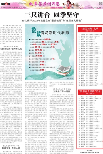 在全国第38个教师节到来之际,2022年度青岛市“最美教师”和“教书育人楷模”颁奖典礼9月9日晚播出。典礼上,经过层层选拔评选出的30名青岛市“最美教师”和29名青岛市“教书育人楷模”依次登场,他们涵盖了青岛的高教、职教、基教、幼教、特教等各级各类教育战线,代表着青岛教师“三尺讲台,四季坚守”的奉献精神。让我们一同走进他们的课堂,倾听他们的育人故事。