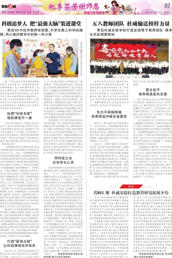 今年暑假,杜威实验学校为全面贯彻党的教育方针,落实立德树人根本任务,提升学校教学、育人水平,实现集团校教师集体成长,学校汇集名家成立教育研究发展中心。该团队由杜威实验学校全国正高级历史教师、山东省首批正高级教师林娟;中学高级语文教师秦会亮;中学高级教师朴贞花;中学高级教师曲兆青;中学高级教师饶建伟;中学高级教师冷传香;中学高级物理教师曲杰; 中学高级教师吴爱梅等多位高级优秀教师组成。“传承校五十八中本部‘以人为本、全面发展’的办学理念,通过名师及学科带头人引领,指导、示范,充分发挥优秀教师‘传、帮、带’作用,汇聚全国优秀骨干先锋教师共同研讨教育教学中的疑难问题,优化教学模式、拓宽育人途径,促进学生全面发展。”除全面研究育人策略外,青岛杜威实验学校校长刘伟向记者介绍,团队还承担着研究新课改,领航新教学的责任。在新课标、核心素养、选课走班、生涯教育、课程开发、班级管理等方面引领学科教师进行深入探讨,积极探索新课改背景下的课堂教学路径,践行新高考理念。探索研发符合我校学生特点的高效课堂教学策略,落实五十八中“学案导学、以学定教”的课堂教学模式。与本部名师一道,通过定期开展教育教学指导和培训及课题研究、教研备课、沙龙研讨、课堂教学展示等活动,让办学理念、管理规范、师资配备、课程标准等与五十八中校本部保持高度统一,为岛城学子提供高品质教育资源环境。