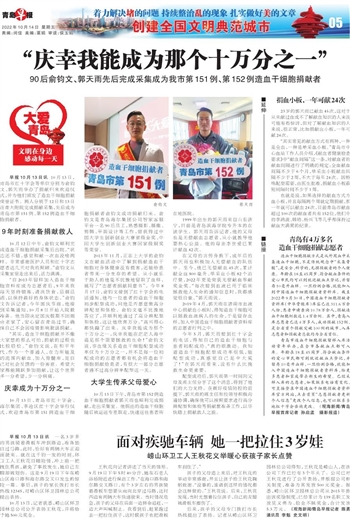 造血干细胞捐献方式是从外周血中采集造血干细胞,不是传统观念中“采集骨髓”,是安全、科学的,无损捐献者的个人健康。年龄在18至45周岁、符合献血条件的爱心市民均可以到就近献血点登记,并留存10毫升血样。一旦检测合格,就能加入到中国造血干细胞捐献者资料库。截至2022年9月30日,中国造血干细胞捐献者资料库(中华骨髓库)库容已达311.6万余人份,患者申请查询10.78万余人,捐献造血干细胞例数达1.4万余例。其中,青岛入库志愿者已达4万多人,成功捐献152例,是全省首个捐献突破100例的城市,入库志愿者和捐献者总数均为全省首位。