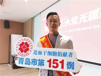 10月13日,青岛市红十字会、海尔集团、李沧区红十字会举行仪式,欢迎青岛市第151例造血干细胞捐献者俞钧文成功捐献归来。俞钧文是青岛海尔集团公司智家客服平台一名90后员工,熟悉摄影、摄像、剪辑、平面设计等工作,曾获得过中国大学生创新创业大赛省级金奖、中国大学生创新创业大赛国家级铜奖等荣誉。