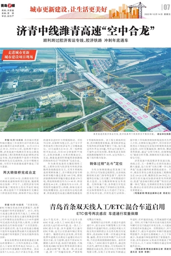 早报10月13日讯 “双重保障,ETC车辆交易成功率显著提升,收费车道通行效率显著提高”。13日,青岛市高速公路首条双天线人工/ETC混合车道系统在青岛交通发展集团有限公司所辖青岛东收费站入口05车道顺利完成技术改造并投入使用,以崭新高效的出行体验迎接广大市民检验。该车道的启用,也为全省高速公路超大饱和车流量收费站最大化提高收费车道通行效率提供了青岛实践和青岛创新。