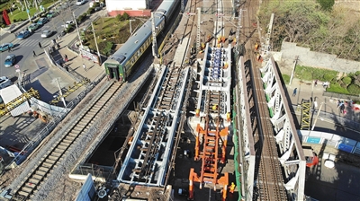 12月5日,有着百年历史的胶济铁路山东青岛海岸路段钢梁桥换梁顺利完成。据了解,该桥始建于1901年,因年代久远,梁体锈蚀、承载力衰减,存在一定安全隐患。铁路建设者通过仿真模拟、数据验算等技术手段,创新采用一体式换梁施工工艺,确保了旧梁拆除、新梁更换施工准确,为后续该路段列车安全通行提供了保障。 新华社发