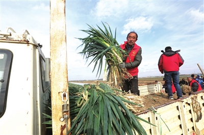 农户将爱心企业购买的大葱装上货车。 观海新闻/青岛早报记者 杨博文 摄