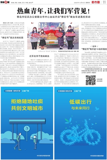 “热血青年,逐梦军营”活动将从12月一直持续进行到明年1月中旬,“青征号”爱心献血车也会在接下来的进校园活动中开进我市10余所高校。2023年全国春季征兵工作已于今年12月1日正式开始,在校大学生可微信搜索“青岛征兵”小程序,了解征兵相关信息。无偿献血有关信息可通过“青岛市中心血站”微信公众号获取,预约咨询可拨打青岛市无偿献血服务热线96606。