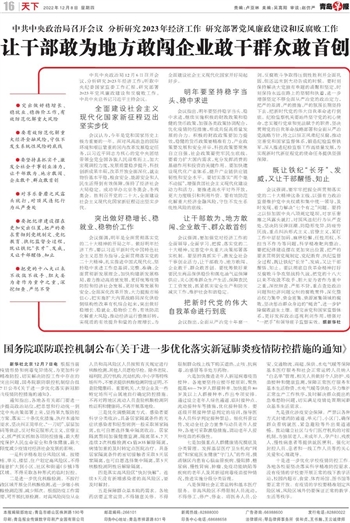 会议强调,明年是全面贯彻落实党的二十大精神的开局之年。做好明年经济工作,要以习近平新时代中国特色社会主义思想为指导,全面贯彻落实党的二十大精神,扎实推进中国式现代化,坚持稳中求进工作总基调,完整、准确、全面贯彻新发展理念,加快构建新发展格局,着力推动高质量发展,更好统筹疫情防控和经济社会发展,更好统筹发展和安全,全面深化改革开放,大力提振市场信心,把实施扩大内需战略同深化供给侧结构性改革有机结合起来,突出做好稳增长、稳就业、稳物价工作,有效防范化解重大风险,推动经济运行整体好转,实现质的有效提升和量的合理增长,为全面建设社会主义现代化国家开好局起好步。