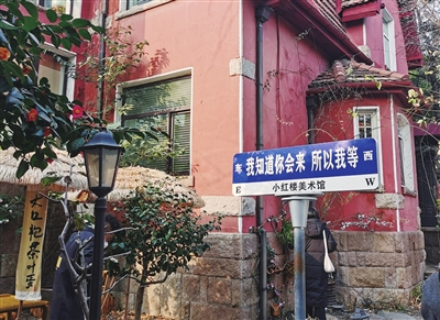 位于安徽路16号的青岛小红楼美术馆,是掩映在百年银杏树之中的德式花园别墅,为三层砖木结构,拥有红瓦坡顶、德式复古门窗。走进庭院,一棵高大的银杏更为百年老房子增添了一抹时尚复古的气息。“小红楼”始建于1913年,早期一直作为私人府邸而存在,德国船舶机械师斯蒂尔洛、知名医生李召华和夫人石雪筠,都曾在这里居住。2013年,嘉木美术馆还曾在这里创立,这座美丽的“小红楼”也终于与世人见面。庭院内,白色的围墙上写满了歌词,成为不少年轻人喜欢的特色和亮点。其中,还有一个写着“我知道你会来 所以我等”的路标,成为了不少游客打卡的素材,少男少女都以这个路标为背景拍照留念。这里是老城区的宝藏美术馆,也是集美术、书房、咖啡馆和艺术交流于一身的文艺休闲场所。
