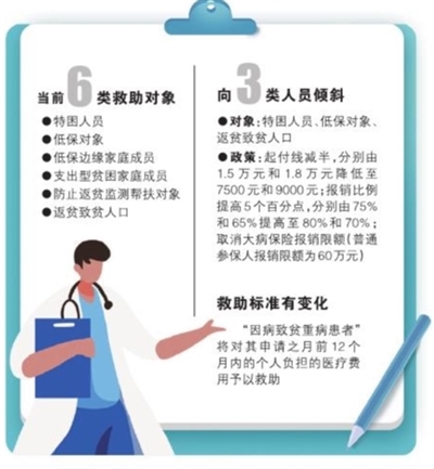 大病保险是在基本医保之后,对个人负担的大额医疗费用予以再保障。《实施意见》首次将职工大病保险与居民大病保险一样向特困人员、低保对象、返贫致贫人口3类困难人员予以政策倾斜,职工和居民大病保险起付线减半,分别由1.5万元和1.8万元降低至7500元和9000元;报销比例提高5个百分点,分别由75%和65%提高至80%和70%;取消大病保险报销限额(普通参保人报销限额为60万元)。通过政策倾斜,更好减轻困难人员大病负担。