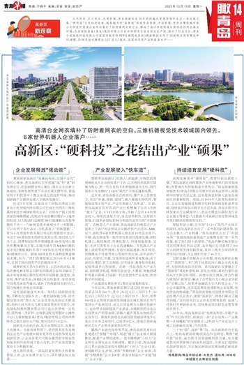 近年来,青岛高新区在抓项目、强产业上持续发力,突出“补链、强链、延链”,做大做强生物医药、智能制造等主导产业,产业发展驶入“快车道”。目前,青岛高新区医疗医药产业已经聚集了全市1/2的“链主”企业,1/3的市场主体,贡献了全市1/4的营业收入,将依托康复大学,突出康养特色,坚持招大育强,打造具有国际影响力和国内竞争力的“中国康湾”。在机器人产业领域,青岛高新区的机器人产业链条上下游已初步形成企业梯次和产业闭环:ABB、安川、新松等6家世界机器人排名前10的企业落户;毕勤、海克斯康等一批外资优质项目落地发展;新松机器人、软控集团、科捷机器人、科捷智能装备、宝佳、北洋天青等本土企业迅速崛起。在机器人产业链上游的零部件领域,有盈可润减速器、旭升视觉、智腾微电子传感等核心零部件供应商;在中游的产品层,有新松、科捷、宝佳等制造商和系统集成;在下游的应用层,有工业制造、公共服务、教育培训机构、安检等诸多应用场景。在新一代信息技术产业方面,抢抓数字机遇,聚焦信息安全、大数据、智能软硬件等重点领域,打造新一代信息技术产业高地,推动数字中国建设。