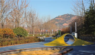 12月19日上午,记者在这里探访时,家住旁边小区的曹女士正在公园里漫步。“公园建成后,大家都愿意来活动。孩子在这里跑跑,大人们在这里聊聊天,健健身。”曹女士开心地告诉记者。路两侧的公园里都设置了步行道,记者走上去试了试,软软的,感觉特别舒服。步行道旁,还设置了一些健身设施和孩子们的游乐设施。