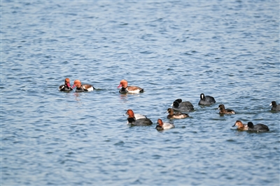 19日上午10点,姜凤鸣开车到了生态大道西侧的池塘边。在众多的骨顶鸡中间,发现了很多白眼潜鸭和赤膀鸭。它们在一起觅食嬉戏,显得热闹非凡。“突然有3只红眼睛、红嘴巴,头部棕红色的鸭子朝我的镜头方向游来。”姜凤鸣说,他赶紧按动快门拍了下来。第一次拍到这么“好看”的鸭子,姜凤鸣很兴奋,立即上网查询,发现它的大名叫赤嘴潜鸭,别名红嘴潜鸭。紧接着,他打电话告知青岛市观鸟协会会长薛琳。看到红嘴潜鸭的照片,薛琳也很兴奋。“在青岛好多年没见到赤嘴潜鸭了,今年又能见到它,很稀罕。”