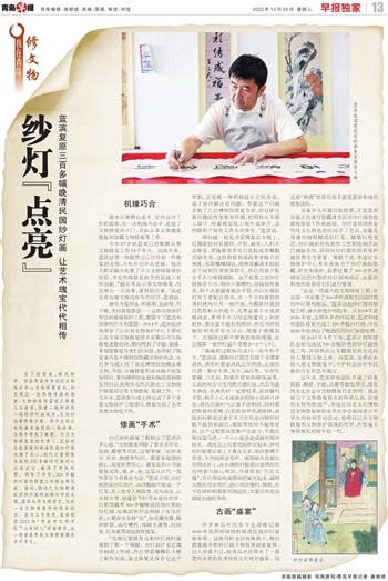 许多青岛市民至今还清晰记得2020年底那场特别的晚清民国纱灯画修复展。这场当时全国规模最大、展出数量最多的纱灯画人物故事画修复展,让人惊喜不已,给青岛市民带来了一场前所未有的优秀传统文化视觉盛宴。而这场“艳遇”的背后推手就是蓝滨和他的修复团队。