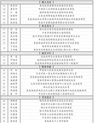 早报12月30日讯 12月30日,青岛市文明办公布2022年第四季度青岛市“文明市民”名单,共有30人入选。他们当中,有发挥桥梁纽带作用助力社区基层治理的退休老党员,有帮助被困礁石男子脱困的退役军人,有坚持拾金不昧打造诚信车厢的公交驾驶员,有细心照顾公婆2000多个日夜的好儿媳……他们用实际行动践行了社会主义核心价值观,厚描城市的文明底色。(观海新闻/青岛早报记者 刘文超)