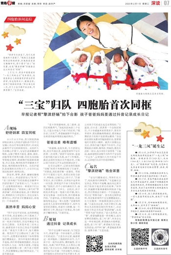 1月31日,青岛早报报道的“一龙三凤诞生记”迎来喜讯,此前在新生儿病房接受护理治疗的舒舒,闯过危险关口,健康出院,回到了妈妈的怀抱。“终生难忘的一天,四个小宝贝都平安出院,可算团圆了。”王蕊说道。