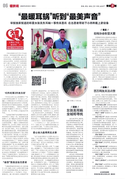 早报全媒体从6月15日开始独家报道、持续追踪此事,相继刊发《即墨全城急寻,咱帮帮这个孩子吧……》《全城搜寻,只为帮孩子寻回 “听力”》《即墨女孩丢失耳蜗一事怎么了?最新……》《善举涌动墨城 涓流汇成大爱》新闻报道,并公布了孩子父亲张衣旺的联系方式,引起社会各界高度关注。从普通市民到学校师生,从爱心企业到公益组织,即墨全城掀起了一场爱心接力。