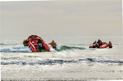 8点36分,在“事发”海域周边值守的先遣队员首先抵达现场,对情况进行勘测后并未发现落水人员。先遣队员通过电台通知其余救援队员海面情况,并告知后方梯队人员携带水下搜索装备。4分钟后,大河东应急工作站值守队员携带动力救生艇抵达事发地,与先期到达的先遣队员协力组装舟艇后,立刻下海展开搜救。