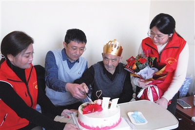 105岁的郑平德老人在家人和志愿者的陪伴下切生日蛋糕。