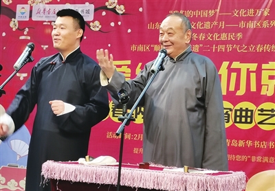 此外,刚刚过去的这个周末,由市南区文化和旅游局、珠海路街道办事处、青岛市新华书店书城主办,市南区文化馆、青岛曲艺社承办的“迎春纳福庆元宵”曲艺喜乐会在青岛新华书店书城举行,曲艺演员们在书香中以评书、相声等多样曲艺形式为来此读书、买书的市民朋友们送上了节日的祝福,而快板《花灯礼赞》这一契合节日氛围的曲艺作品更是受到了读者朋友们的喜欢,现场还精心设计了“闹元宵·猜灯谜”的民俗活动。青岛本土知名曲艺演员朱琦表示,曲艺的舞台一直都是根植于民间的,走出剧场,才能走进观众的心中。