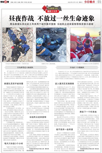 在气温达到-10℃的土耳其震中附近城市马拉蒂亚,搜救工作一刻未停。从当地时间2月12日凌晨投入救援的青岛即墨蓝天救援队,截至昨晚已在多个点位连续搜救36小时。昨日,早报记者从蓝天救援队队长董刚处了解到,他们和当地救援队分组轮换,昼夜不停地对多个点位展开搜救。当地民众送来面包、糊糊汤等当地食物,感谢来自中国青岛的救援队员。