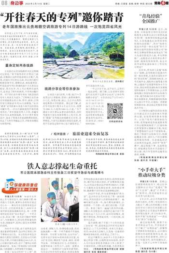 正在旅行社咨询线路的市民王阿姨对记者说:“春节假期我们本想出门旅游,但像丽江这样的旅游地太火爆了,机票、民宿比平时贵出几倍,所以我们把行程推到春节后,错峰出游,体验感更好。听说旅游专列比普通的旅行方式更安全稳定,景点也多,车上可以观赏沿途风光,还省去了转车的麻烦,不用来回搬行李。对于我们坐车晕车和坐飞机恐高的老年人来说尤为适合。”王阿姨正在咨询老年国旅推出的云南、贵州、湖南、江西四省空调旅游专列14日游路线。“此次‘踏青’系列的重头戏是今春开启的青岛首趟专列,一次出行就能饱览四省的绝美风光。”老年国旅负责人介绍,首趟专列分为A、B两条线路,专为中老年朋友设计,省去了常规火车旅游换乘的困扰,免去了大件行李搬运之苦,并配有保健医生保驾护航。