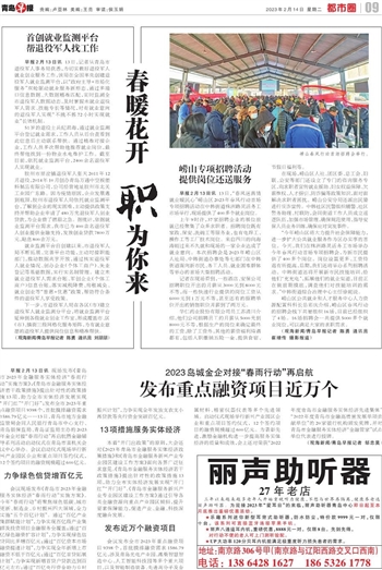 早报2月13日讯 现场发布《青岛市2023年金融服务实体经济“春雨行动”实施方案》;《青岛市金融服务实体经济若干政策措施》提出针对性的政策措施13项,助力全市实体经济发展实现“开门红”“开门好”;发布全市2023年重点融资项目9398个,首批摸排融资需求1586.79亿元……13日,青岛市地方金融监管局会同人民银行青岛市中心支行、青岛银保监局、青岛证监局主办的2023年金企对接“春雨行动”再启航暨金融辅导系列活动启动仪式在青岛市直机关会议中心举办。会议启动仪式现场举行新兴产业园区企业和重点项目签约仪式, 12个签约项目的融资规模超过600亿元。