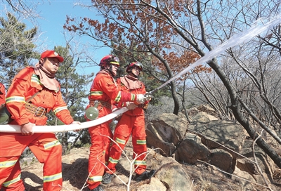 山顶惊现“火情”,无人机出动侦查,救援队员身背40斤重的装备,沿着山林攀援1000米,在高压水车的配合下把“山火”扑灭……昨日,李沧区城市建设管理局组织区森林防火应急中队在李沧东部山林(卧狼齿)开展森林防火应急演练。