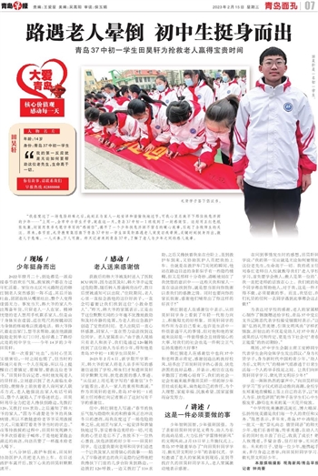 “我在度过了一场危险劫难之后,此刻正与家人一起安详和谐愉快地过节,可我心里总放不下那位扶危济困的少年……”上周一,全市中小学生开学,就在这一天,青岛37中初一1班收到了一封感谢信。这封用正红色纸张包裹、封面用隶书毛笔字书写的“感谢信”,揭开了一个少年扶危济困不留名的暖心故事,引起了全校师生的关注。原来,春节前,礼贤教育集团旗下青岛37中初一学生田昊轩路遇老人突发旧疾晕厥,关键时刻挺身而出,救老人于危难。一人兴善,万人可激。昨天记者来到青岛37中,了解了老人与少年之间的感人故事。