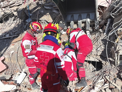 青岛红十字搜救队在土耳其阿克苏玛市执行搜救任务。