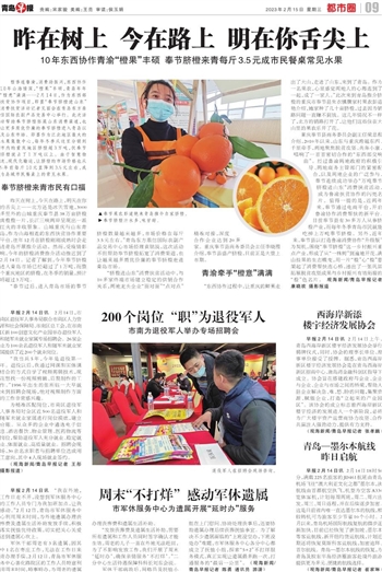 橙香连鲁渝,消费助振兴,东西协作10年山海情深,“橙果”丰硕,青岛年年“橙意”满满……2月14日,作为东西部扶贫协作项目,即墨“奉节脐橙进山东”消费扶贫活动记者见面会在青岛东方鼎信国际农副产品交易中心举行。此次活动帮助奉节脐橙拓展山东消费渠道,也让更多质优价廉的奉节脐橙进入青岛以及山东市场。即墨作为江北地区最大的水果集散中心,每年冬季从这里分销到市内的重庆地区脐橙超3万吨,仅奉节脐橙就占了1万吨以上。由于智慧物流、现代化输运,让脐橙的市场价格也从5年前每斤10元直降到3.5元左右,成为岛城市民餐桌上的常见水果。