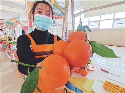 ▲奉节果农彭道艳来青岛推介自家脐橙。